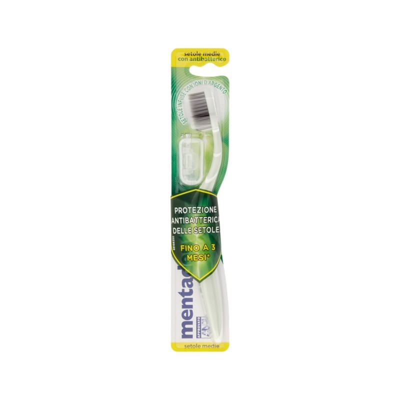 Mentadent Esperti In Prevenzione Setole Medie Con Antibatterico: Esperti in Prevenzione Setole infuse con ioni d'argento che riducono la crescita dei batteri sulle setole aiutando a proteggere lo spazzolino. Manico a tripla angolazione: facilita il raggiungimento dei denti posteriori. Morbido pulisci-lingua posteriore in gomma: pulisce la lingua per un alito più fresco.Si consiglia l'utilizzo con il dentifricio Mentadent P Prevenzione Completa. La sua formula con Zinco, un antibatterico di origine naturale, aiuta a prevenire i principali problemi orali. Approvato ANDI - Associazione Nazionale Dentisti Italiani L'A.N.D.I. riconosce che Mentadent P setole con Antibatterico risponde a standard qualitativi elevati. Abbinato ad un dentifricio al fluoro, se utilizzato correttamente e sostituito di f